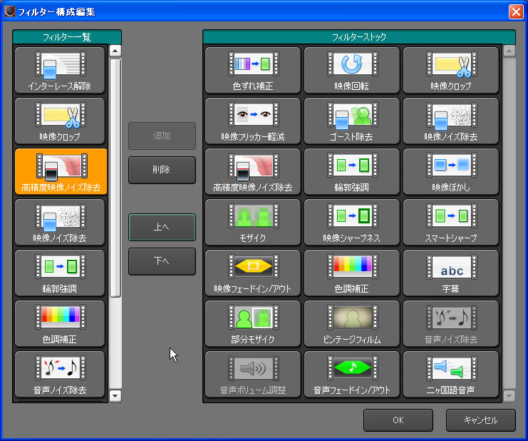 「高精度映像ノイズ除去」の方がノイズ除去の性能が高いのですが、細かい所にこだわらなければ「映像ノイズ除去」でも十分にノイズが取れます。 私の場合、習慣的に「高精度映像ノイズ除去」を使っていたので、上の説明でもそうしていました。 ところが「映像ノイズ除去」を使ってみたところ、かなりの時間短縮になりました。 30分番組のエンコードでは、「高精度映像ノイズ除去」で1時間30分強かかっていましたが、 「映像ノイズ除去」では20分でエンコードが終わりました。 大量のビデオを処理することが前提ですので、時間、電気代、省エネなどを考えると「映像ノイズ除去」でもいいのかもしれません。 |